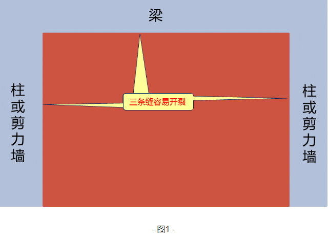建筑上經(jīng)常出現(xiàn)不同材質(zhì)的構(gòu)件之間連接,比如,框架柱、梁與砌塊墻之間連接;剪力墻與砌塊墻之間也經(jīng)常發(fā)生連接。因為是不同材質(zhì),又在不同時間施工,連接縫隙就很容易發(fā)生開裂,如圖1所示。