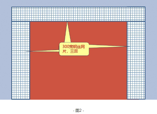 這時候就需要加上鋼絲網(wǎng)片,防止不同材質(zhì)的構(gòu)件之間發(fā)生開裂,如圖2所示。