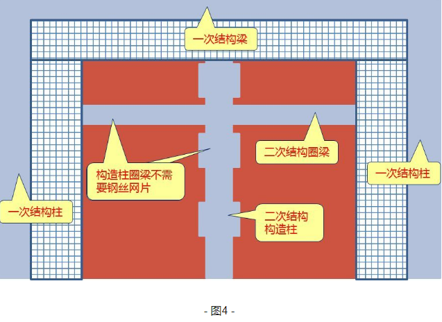 二次結(jié)構(gòu)構(gòu)件(構(gòu)造柱、圈梁、過梁)與砌塊墻之間的連接,不需要增加鋼絲網(wǎng)片,因為二次結(jié)構(gòu)與砌塊墻是同一時間施工的,它們本來就是一體。如圖4所示。